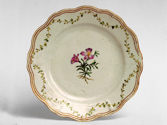 这是一件瑞典东印度公司的订货样品盘。在盘的折沿上用蓝、绿、浅红、褐色和金色几种彩釉绘出四种不同风格的装饰纹样,以供订货者选择。
