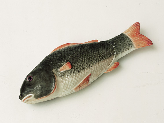 汤盒呈鱼形,用黑彩绘头、身,用矾红染鳍、尾,鱼腹处设为汤盒盖,可以打开。此汤盒的釉色透明清澈,造型栩栩如生。