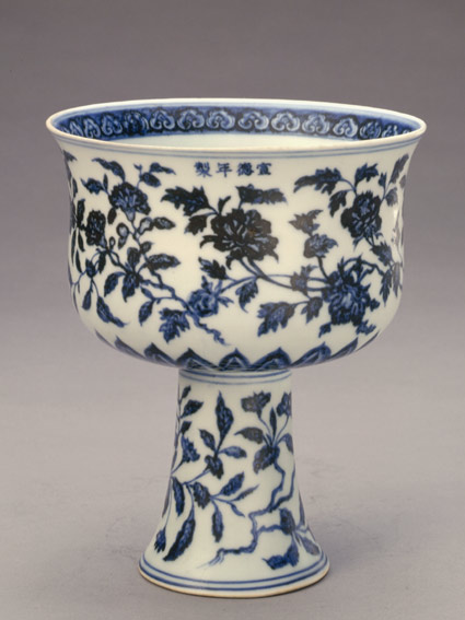 碗撇口,深腹,喇叭状中空高足。里心绘一束莲纹,口沿下绘一周如意头纹,外壁绘折枝花卉纹。外壁口沿下自右向左横书“宣德年制”四字楷书款。