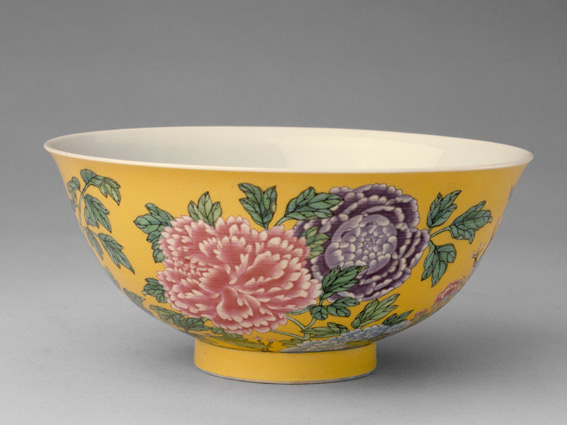 碗撇口,弧腹,圈足。里施白釉,外壁黄地珐琅彩牡丹纹装饰。外底白釉地上署胭脂红彩“康熙御制”四字双行印章式款。此器造型规整,彩绘笔触细腻,牡丹花在娇艳的黄釉映衬下愈显华贵富丽,其装饰风格反映了当时皇家的审美情趣。