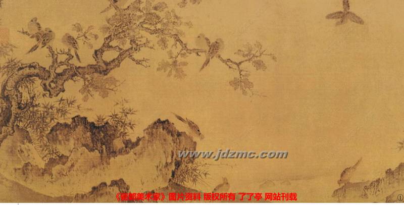 1《竹石锦鸡图》 五代黄居寀绢本浅设色纵23.6 厘米横 45.7 厘米 黄居寀(933—?),字伯鸾,成都(今属四川)人,黄筌幼子,曾先后为后蜀、北宋翰林待诏。画继家学,擅花竹禽鸟,精工细致。此图描绘一河岸边群鸠嬉戏的场景。树干盘曲,枝叶婆娑。画石画树笔法琐细,但造形具体,如树木枝干节叶,无不合法周到,其画竹画鸟则笔法精细。其用墨以淡为主,重墨勾点,层次分明。其着色简淡,既体现了黄家富贵的品质,又具有温和淡雅的格调,体现了北宋初期画院的典型风格。