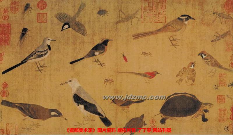 6《写生珍禽图》 五代黄筌绢本设色纵41.5 厘米横70 厘米黄筌(约903—965),五代后蜀画家。字要叔,今四川成都人。历仕前蜀、后蜀,官至检校户部尚书兼御史大夫,擅画花鸟,自成一派,作品多描写宫廷中异卉珍禽,先用淡墨勾勒,然后以重彩渲染。后人将他与江南徐熙并称“黄徐”,有“黄家富贵,徐熙野逸”之评。《写生珍禽图》描绘了龟、蝉、麻雀、鸠等20 多种动物。从画面“付子居宝习”来看,显然是一幅课徒的写生稿本。