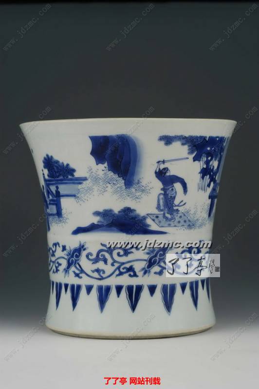 青花人物舞剑图敞口笔筒 高20.7 cm 宽21.8 cm 底17.3 cm