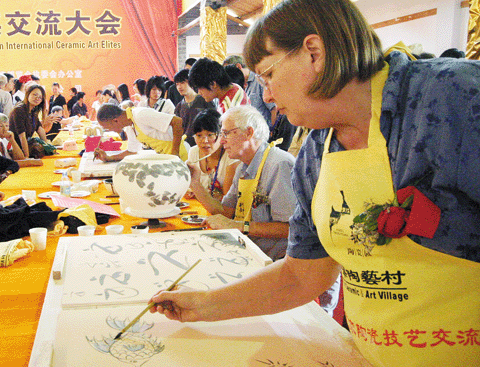 陶艺村里的“798” 10月19日下午的陶艺交流馆,俨然是一个“798”。不过陶艺村的“798”更多陶瓷元素,更多国际元素,各种陶艺文化得以在此兼容并蓄。 陶艺交流馆从外面看是一座仿古建筑,朱漆的窗花、红墙青瓦,民族特色浓郁。但走进里面,却发现它的“798”特色,青砖砌起的柱子不加任何修饰,场地宽阔布置简单。陶艺村负责人陈金冰说,这样陶艺家们的发挥能够更加轻松自如。 事实正是如此。陶艺家们在此很是放松,或泼墨挥毫,或精雕细琢,或笑谈陶艺,无拘无束。一两个小时内,一件件精美的陶艺品便美轮美奂地呈现在观众的眼前了。 |