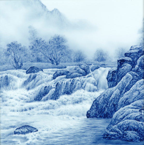 隆冬,雪花披着素洁的纱衣,迈着轻盈的舞步,把这个季节特有的风情带到人间。古往今来文人吟唱离不开她,.忽如一夜春风来,千树万树梨花开.、.窗含西岭千秋雪,门泊东吴万里船...在文学宝库中留下了一首首千古绝唱。 由于多年从事古陶瓷研究,几分钟爱。一次,被邱明政的作品所深深吸引。她擅长粉彩山水、青花山水和雪景,早年跟随景德镇著名陶瓷美术家王云泉学习粉彩山水,后又追随青花工艺大师陆履峻先生研究青花艺术。听着友人的介绍,面对这布局严整有序,沉着典雅的圣境,邱明政的陶瓷艺术给我留下了极深刻的印象。 近些年,邱明政重点研究青花冰雪山水艺术,且作品颇丰。她的青花雪景作品一改景德镇传统粉彩雪景和青花山水的描绘中采用堆白和留白的手法,以其深厚的粉彩功底,借鉴了西洋油画和国画雪景山水画技法,创立了自己独特的青花冰雪山水画风格。从她的作品中你能够观察出她对谋篇布局、画理层次、料分五色的完美把握。欣赏她的青花雪景画,让人感受到她笔下的雪,丰满而不壅塞,空灵而又多情,把原本千姿百态的世界装扮得如幻如梦。看那陡峭的山峰,虬劲的苍松,也一改往昔峥蝾嶙峋之态,呈现出磅礴豪迈之情;看那滔滔江水,湍急的河流,也收敛起平日里不驯的“性,缓缓流淌着万种柔情;再看大雪下的几间草屋连同天边的一勾晓月,无不沁出浓浓的乡情。诚然自然界里的雪给人的感觉有时也萧条冷寂,但在邱明政的青花冰雪艺术世界里却永远充满着温情、希望和生命力。山为静,水为动;树为静,云为动;地为静,雪为动,这就是一幅幅大自然中鲜活的美景在邱明政青花冰雪山水艺术作品中的表现,她让你徜徉在清雅、古朴、幽怨的意境,留恋忘返。