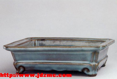 清乾隆天蓝釉长方花盆 色调柔和的天蓝釉在清朝甚为珍贵,只供烧制宫廷御器使用。17世纪中叶,由于明末不断的战乱及政权的更迭,之间经历了一个官窑由盛而衰的转变过程,此类釉料的烧制技术应在过渡期后,清王朝重整皇家窑厂后研制而成。此器可能释仿北宋钧窑天蓝釉花盆而作。