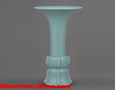 清乾隆 粉青釉出戟花觚 此器通体饰粉青釉,莹润清新,为清代颜色釉中的佳作。乾隆朝时中国瓷器集大成的时期,各类仿古瓷皆见烧造,此器便是其中的精品。型呈商青铜觚型,施以莹润细腻的粉青釉以仿南宋龙泉釉。