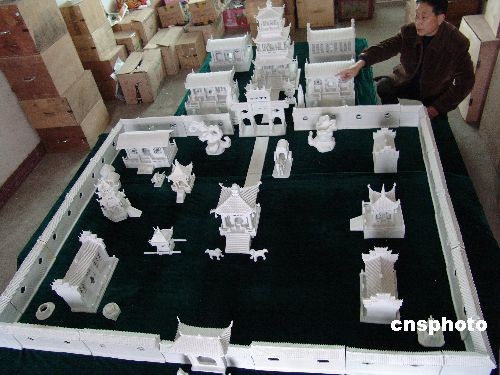 3月8日,江西省景德镇罗冬根展示作品瓷器群雕《大观园》。景德镇陶艺家罗冬根用6年的时间,制作出面积达80平方米,主件有300多件的瓷器群雕作品《大观园》。这部作品由建筑、园林、山水、民俗等部分组成,采用高白泥涩胎瓷制成,取题于《红楼梦》大观园,取材于苏州园林和江南徽派建筑。中新社发 石卫明 摄