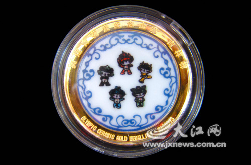 全套纪念章背面分别为金银质地的北京奥运会吉祥物福娃的38个运动分项造型,正面则全部采用了镶嵌剪纸造型的青花瓷片。整套纪念章的青花瓷全部在景德镇烧制完成,每块瓷片直径仅两三厘米,厚度约两毫米,工艺要求极高,所有的设计和烧制均出自大师之手。