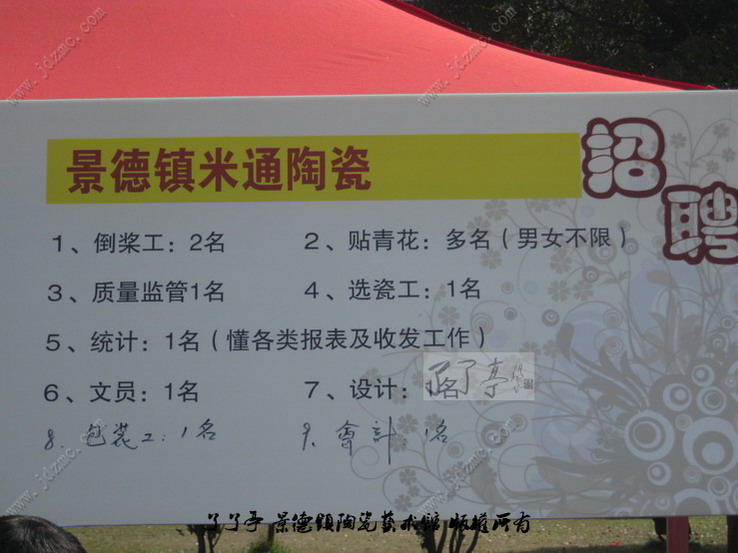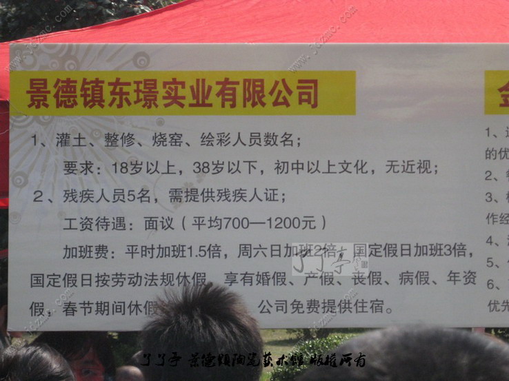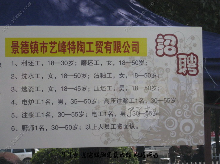 景德镇市中心休闲广场今天举行了一个“关爱女性·服务返乡人员”的招聘会,因为是在市中心,而且没有入场费,所以人群比较涌动。我特意将里面一些关于陶瓷方面的招聘拍了下来,希望能够对景德镇区网友有些帮助。了了亭·李申盛/文