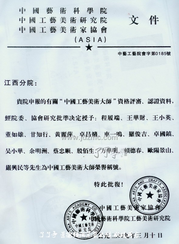 江西分院:贵院申报的有关“中国工艺美术大师”资格评审、认证资料,经院委、协会研究批准决定授予:程履端、王华财、王小英,董如雄、甘知行,黄丽萍、卓昌赣,车一鸣、罗俊吉、卓国镇,吴小华,余明洲,蔡忠顺、殷佰生,方华明、赖德春、欧阳景山、严兴民等先生为中国工艺美术大师荣誉称号。