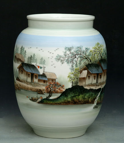 艺术感染人的最本质的地方是形式后面的“神”。 中国画讲写意, 讲的是外师造化, 中得心源。 “情”也罢,“意”也罢,讲的都是作者主观感受、思想品格、艺术修养以及智慧、才情的融洽。触景生情, 笔随心意, 山水的构图造型不受客观景象的制约。古人云: 不求形似,但求神似。不似真山真水,却胜似真山真水。陶瓷山水画要借古开今,就必须开拓创新, 新在哪里, 重要的当是画家的思想新、感情新、观念新,一句话“神”要新。起统帅作用的“神”焕然一新,那被统帅的“形”一一语言技巧,也就不得不新。