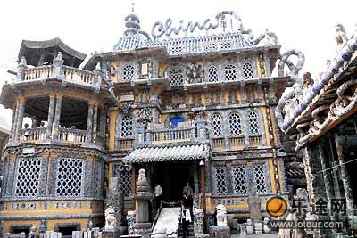 在他的瓷屋子里,外围的“瓶”安墙,用的是大小不一的635个古瓷瓶堆砌而成,瓷瓶与瓷瓶之间的缝隙用水晶石填充。瓷房子的入口,首先映入眼帘的是盘旋在房子上的瓷龙,它全长768米,是世界上最长的一条古瓷龙。房子左右两侧的瓷龙(共计4条)从地面蜿蜒至墙头,在楼顶蜿蜒出五个英文字母“China”,它们全部由钧瓷碎片拼接而成,字母之间首尾相连,曲线流畅,造型生动,有种音符的跳动感。凉亭阳台的顶部,全部被完整的古瓷盘所覆盖,中间的一圈全都是世间少有的鱼纹盘,屋内楼顶部用古瓷瓶拼贴出的“女娲伏羲”,表达出一种人类生生不息、代代相传的美好愿望。像这样的创意在瓷房子中比比皆是,这里真得是“处处是故事,点点是灵感”。