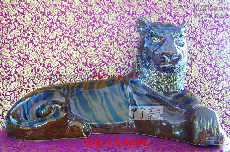 《卧虎》是一尊圆雕,是一件写实具象的瓷雕。虽是卧姿,但昂然挺立的虎头上,一对锐利的目光勇视前方,似乎准备随时一跃而起扑下山冈撕啮猎物,正所谓“引而不发跃如也”。其卧姿造型,丝毫不亚于扑腾猛虎的威风凛凛,且其静中寓动的神韵表现力难度更大。尤为难得的,是其体外装饰了不同的黄、黑、花等高温颜色釉,由于烧炼的时间、材质、窑温不同,使得出窑的虎瓷雕成品颇多意外惊喜,有的作品,很可能是可遇不可求的高温色釉窑变绝品或孤品。