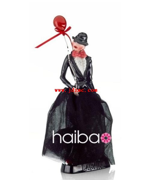 此举是为向品牌创始人JeanneLanvin(让娜·朗雯)致敬,正如该品牌母子图商标所体现的那样,JeanneLanvin的成功始于为女儿制作服装和她俩著名的母女装扮。瓷偶穿着品牌2009春夏的服饰,比例缩小数倍,但神韵不减。水晶石、珍珠、缎带、亮片等装饰都是用实物制作,使瓷娃娃更为逼真生动,仿佛真正的时装玩偶。不知景德镇的陶瓷设计师们能否从中偷学到一点灵感呢?每款瓷偶限量发售800件,售价折合人民币约为3000元一个。