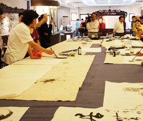 艺术家相聚一起,挥毫泼墨,创作交流,他们精湛的技艺不时引来阵阵的掌声和啧啧称赞。