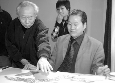 张文祥得知本报推出“我为灾区送瓶水”大型公益活动后,主动提出义卖自己的作品赈灾。没想到昨天当王锡良得知本报这一活动后也非常支持。王老说,帮助灾区人民渡过难关是好事,我们都应该出手帮忙。于是才有了两大师联手创作佳作义卖赈灾的感人场面。
