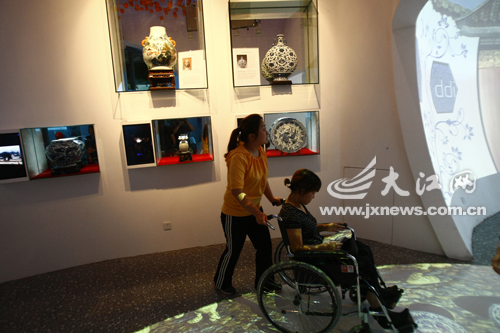 青花瓷、瓷乐队、陶艺大师现场作画,10时走进江西馆,来自上海音乐学院的导游小姐马艳婷,如数家珍般把江西馆的景德镇元素向记者娓娓道来……“上海世博会中国省区市联合馆内的江西馆设计独具一格,其外形是由三个大小不等的青花瓷容器组成,代表着好客的江西人喜迎四面八方的来客。当人们踏入景德镇展区一条波光粼粼的溪流时,就会有青花瓷片浮出水面,伴随着人们的脚步在水中荡漾。”马艳婷清脆而动听的讲解,令在场的游客一片陶醉。