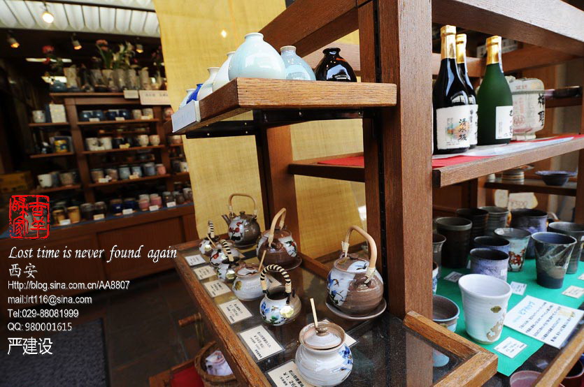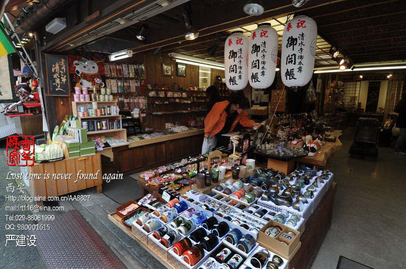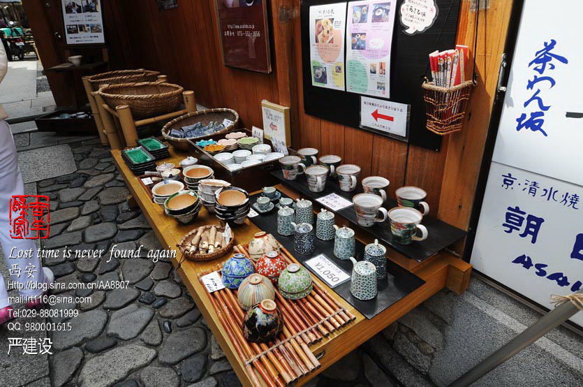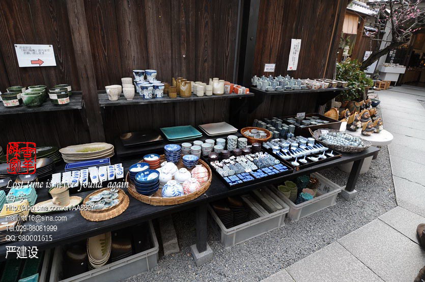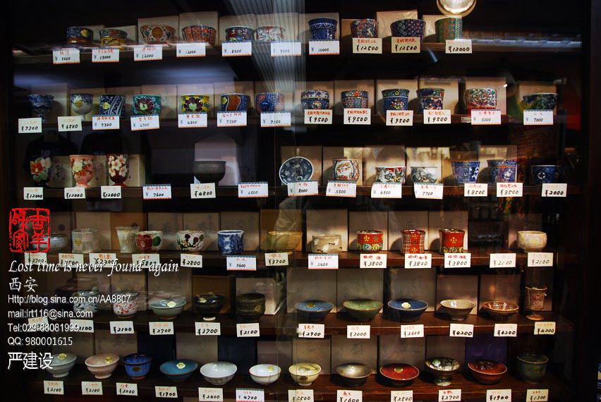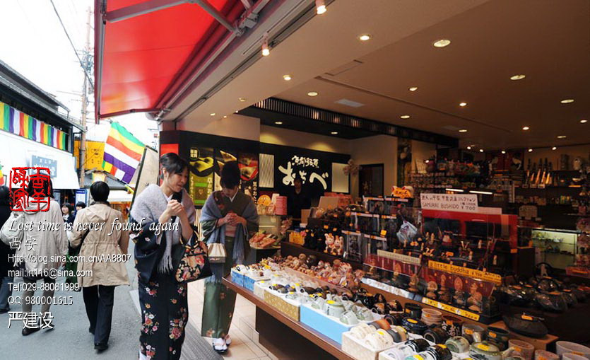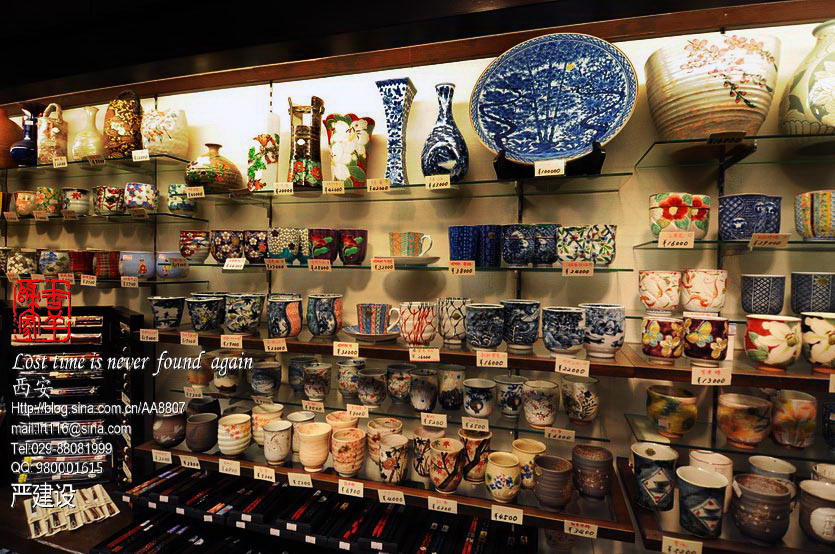 我和老妻随女儿、日本朋友在京都清水寺步行街上逛。这里店面鳞次栉比一家挨一家,房屋矮小非常整洁。其中最多的是瓷器店、陶艺坊。有的临街开设门面,有的是一所院落,进去看时,类似园林建筑,只是四面八方摆满了陶瓷。价钱很贵。看到一只金边细瓷薄胎碗,叫做紫交趾四季花草舟形花器,标价350万日元/只,折合人民币245000元。能换3辆标准型家庭小轿车。贵吧?