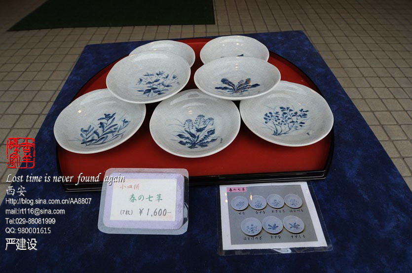 还看到有核桃大小的青瓷碟子,标注为春之七草的1600日元/7枚。日本的七草指芹菜、荠菜、母子草(鼠曲草)、繁偻(鹅儿肠)、萝卜、佛座草(接骨草)、芜菁(圆萝卜)。把萝卜叫做草,新鲜吧?