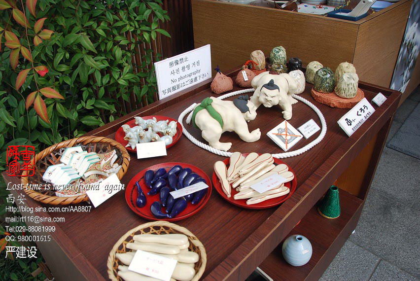 走进森陶瓷馆、朝日陶庵、清水烧陶瓷器本铺,看到1套2寸大小的仿古组人像,标价6500日元/套,以为是八仙,凑近前看看,原来是日本七福神。据说正月初,日本有祭七福神习俗。七福神指惠比寿神、大黑天、毗沙门天、辩财天、福禄寿神、寿老神、布袋神。