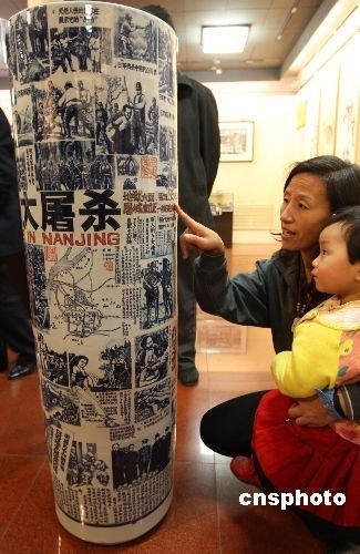 一件由百余幅南京大屠杀史实图片烧制成的陶瓷作品《南京大屠杀》由中国陶艺大师蔡世文创作的陶瓷作品《南京大屠杀》赋予陶瓷艺术崇高的灵魂,将中国古典文化与中华悲惨历史相结合,给人以震撼。该作品荣获08届“瓷都杯”全国陶艺大赛金奖。中新社发史利摄