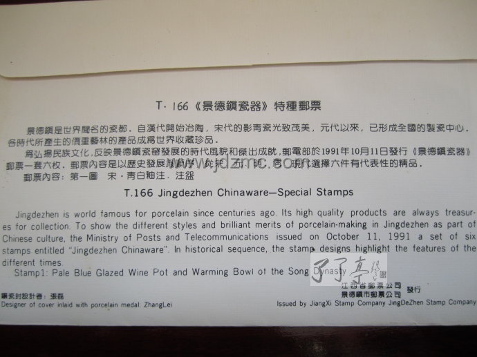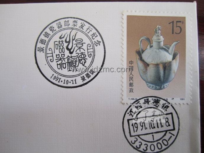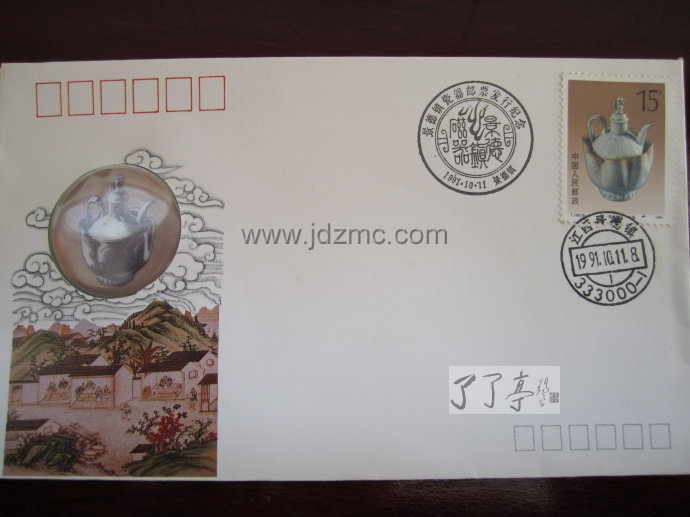 “景德镇瓷器邮票首日封” ,是带瓷器的首日封。这套邮品一共六枚。在首日封正面的右上角,贴有一枚面值0.2元的瓷器照片邮票,并盖上了“景德镇邮政”邮戳,其日期为“1991年10月11日”。左方上首是六个红线印制的方框框,供使用人填写收件人邮政编码的。在它的最下面是一个漂亮的方形图案。最奇特的是首日封左边的中间,这里有一个被挖空直径约4厘米的圆形,贴上了相应大小的透明塑料纸,塑料纸的下面是一块烧制的薄薄的圆形陶瓷,异常精美,有点像纪念章。这枚圆形陶瓷和右上方的邮票是一模一样的。换言之,这枚包裹在信封中的“袖珍瓷器”实际上是陶瓷图案的“微缩版”。其瓷质细腻,小巧玲珑。六枚首日封,镶嵌着六枚“袖珍瓷器”,虽然各放异彩,但又是同一整体。严格地说,这种特种邮品根本不可能用于邮寄信函,只能供人收藏。