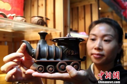 图为参展商展示一个台湾阿里山小火车造型的紫砂壶,独特的造型创意十足。刘占昆 摄