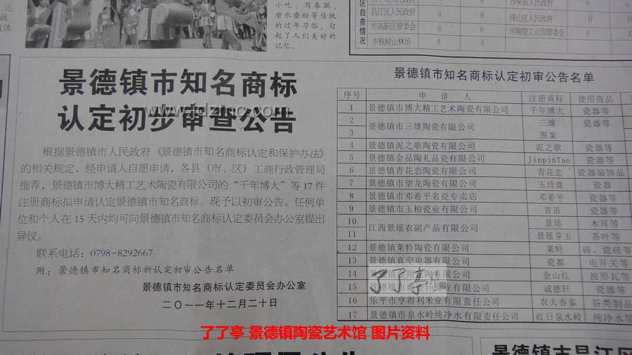 根据景德镇市人民政府《景德镇市知名商标认定和保护办法》的相关规定,经申请人自愿申请,各县(市、区) 工商行政管理局推荐,景德镇市博大精工艺术陶瓷有限公司的.千年博大.等17 件注册商标拟申请认定景德镇市知名商标。现予以初审公告。任何单位和个人在15 天内均可向景德镇市知名商标认定委员会办公室提出异议。 联系电话:0798-8292667 附院景德镇市知名商标新认定初审公告名单 景德镇市知名商标认定委员会办公室 二O 一一年十二月二十日