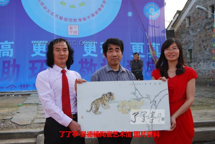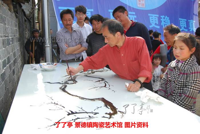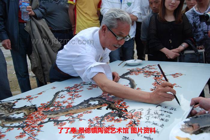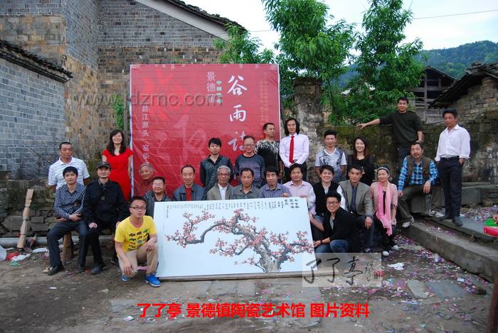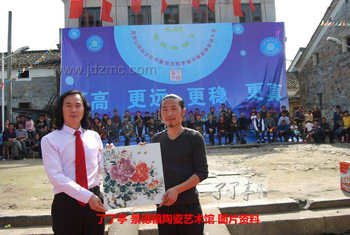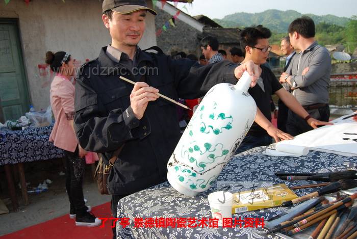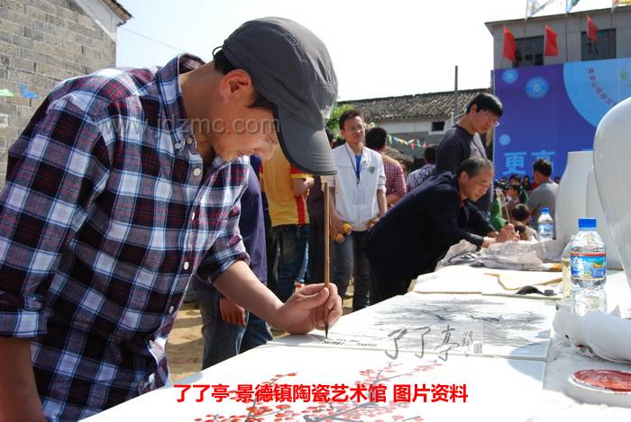 4月22日是世界地球日,是高朋山民俗文化节暨千禧瓷缘亲朋大会的喜庆日子,国际儒商学会文化艺术部部长创意运筹的同一个世界、同一个地球、同一个家大型民族民俗文化活动在这一天举行。这里是高朋满座,座无虚席,来自中国陶瓷美术界的艺术家们兴致勃勃地参加景德镇美术馆、昌南书画院组织的中华瓷艺六法交流笔会,童承天是景德镇市陶瓷美术大师、景德镇市非物质文化传承人,为了参加本次活动,他的老伴与他通行,来到梅源村中华瓷艺六法交流现场,童承天第一个登台表演,拉开了笔会序幕,卓国镇现场创作了一幅梅花正得梅源主题,成为本次大会的主题作与形象作。胡忠胜夸童承天不愧是红色画团的团长,每次笔画总是打响先锋第一枪,戴德全、余天荣应声而上,戴德全系江西省高级陶瓷美术师,也是省工艺美术大师和江西省陶瓷美术大师的储备师力,在六法交流笔会中,戴德全选择在瓷板上画虎,一幅金色年华画有多枝金色野花,烘托气氛,瓷画主题趣意融融,作者选择一块小方板,绘声绘色地画出一只虎头,寓意画虎头享头福,余天荣是一位实力派山水瓷画家,现为江西省高级陶瓷美术师,他在本次交流笔会中选择一件150件的瓷瓶,仍以远山无树,近树茂叶的常用手法表现出雾里有山,湖中天色的漓江山水晨雾中之春夏。金伯文是一位警官艺术家,去年被江西省艺术工作委员会授予景德镇市陶瓷美术大师荣誉称号,作为公安作家的金伯文,他的作品不但立意简洁、构图大方,而且承载着丰富的人文思想,是一位大写意,抽象派快手瓷画家,在本次笔会交流中,同一时间,金伯文完成了《南归图》、《双鹰图》和《莲生贵子图》。江西省陶瓷美术大师雷大辉更是带头参加笔画,一连写了十副字画以表对高朋山村友的有缘之情。