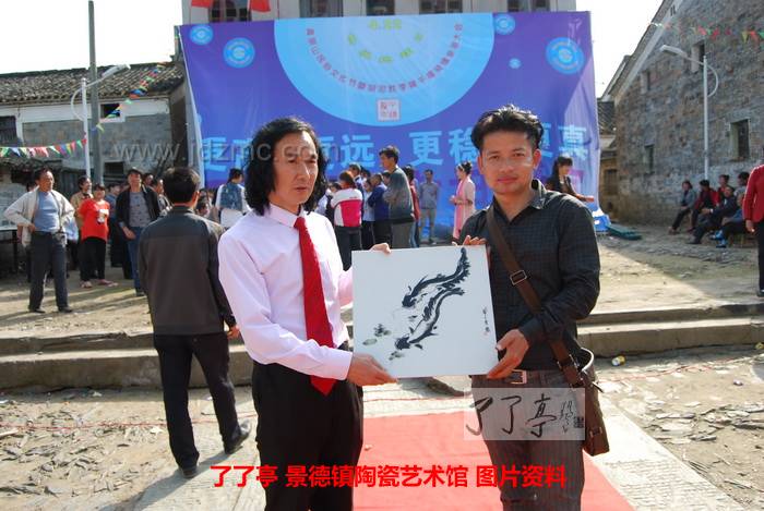 ,在本次笔会交流中,高海以40*40方瓷板,用粗墨的线条,将两条鲶鱼描绘得恩恩爱爱,江西省高级陶瓷美术师徐普阳曾在早年当过多名大师的枪手,现在的徐普阳由于笔力老到,技法娴熟,作品深受藏家的喜爱,在本次六法交流笔会中,徐普阳用二尺六瓷板画以山水画《乡情》题材创作出“人同青松一般长,瀑流到远量路长,乡情一幅相思画,游子痴笔恨天涯”的念君情愁。