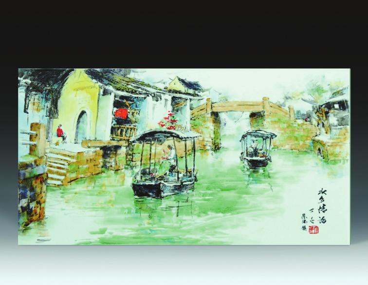 赏丁千作品,有一种宁静而超凡脱俗的感受,使人忘了尘俗的烦恼。他在构思上为了凸显自然的宁静美,安排人物不多,适当点缀人物,也是恰到好处,有“点睛”之妙。他的构图布局,看似平淡,实则蕴藏着更多文人画气质。在色彩的处理上也别具一格,既重视整体协调统一,更强调对比色的运用,使画幅色调更鲜明,不落俗套。丁千作品的鲜明艺术语言,在视觉上给人一种留恋感,一种美的享受,回味无穷,乡情隽永。对于景德镇的陶瓷艺术,是可喜的,有意义的探索!
