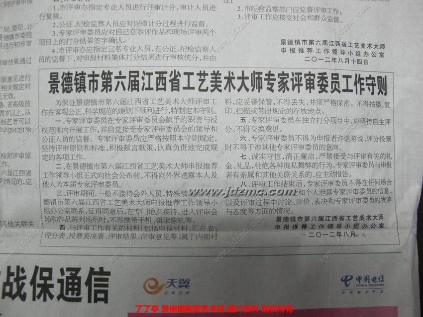 二、在景德镇市第六届江西省工艺美术大师申报推荐工作领导小组正式向社会公布前,不得向外界透露本人及他人为本届专家评审委员。