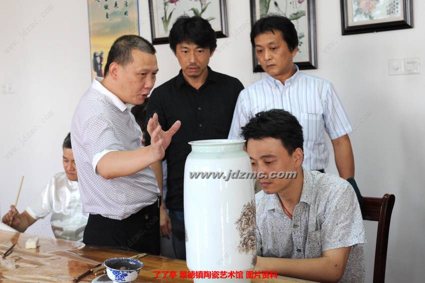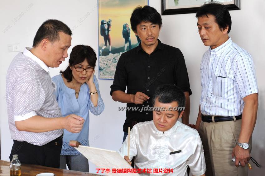 龟井味乐先生一行陶艺交流团的到来,受到了技能大师李贵镇的热情接待,他们来到国家级李贵镇技能大师工作室,参观了工作室的艺术陶瓷展厅,一件件由李贵镇大师暨其他陶艺家们制作的精美陶瓷,让他们目不暇接,惊叹不已!真的有一种:“此物只应天上有,人间哪得几回见”的感觉,不停地要求在这些精美绝伦的陶瓷作品前拍照留念。在工作室陶瓷彩绘工作间,眼前工作室的陶艺家们笔酣墨饱,酣畅淋漓的用笔技巧,如行云流水般的飞毫。有画釉上彩的,有画青花暨釉下彩的。他们的画面中;山水、花鸟、人物、走兽等无处不涉及。他们一边观看,李贵镇大师一边语速精炼地讲解,更是把龟井味乐先生一行看的目瞪口呆。惊叹国家级李贵镇工作室的陶艺家们个个身怀绝技,敬佩有加。而在工作室里的陶吧里,龟井味乐先生更是饶有兴趣地与李贵镇大师现场切磋了一回拉坯绝活。龟井味乐先生拉的坯胎也是让人心服口服,不愧是十五代的传人!