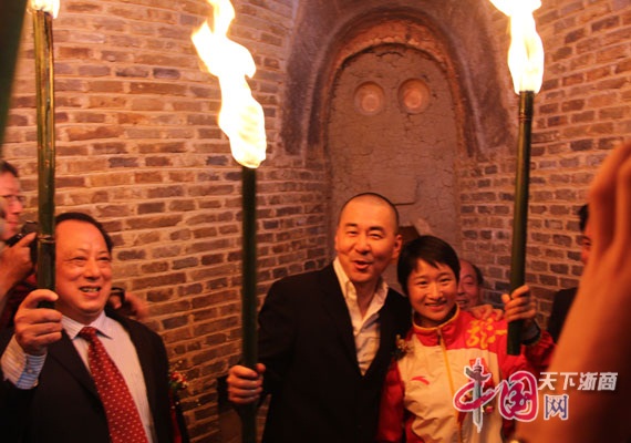 10 月22 日上午,持续多日晴好的天气突然转凉,并下起了绵绵细雨,这天是古窑民俗博览区内的宋代龙窑、明代葫芦窑和元代馒头窑开窑认证之日。记者曾见证了这座宋代龙窑的开工、挛窑、复烧等各阶段,当然不能错过开窑这个.最精彩.环节。前一天,就听说当天开窑门的方式与众不同,由奥运卫冕冠军吴静钰用脚来踹开,记者为此提前半小时赶到了宋代窑房里,不曾想,守候在此的各路媒体记者已达几十位。记者们手持长枪短炮,寻找开窑门时刻最佳拍摄位置。