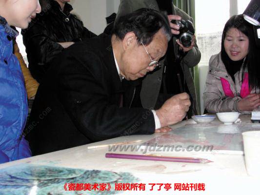 现场学习观摩 元月12 日上午,户外依然寒风瑟瑟,但教室内的学员们三五成组,热烈地讨论和交流着创作思路、笔法、技艺,以及调色、调釉等实践经验或心得或疑惑,气氛温暖如春。9点多钟,张松茂大师走进了教室,学员们立时蜂拥而上。 张松茂大师微笑着与学员们示意,走到讲台下方驻足,眼睛凝视着讲台上学员所作的一块山水瓷板画,还用手摸了摸。在学员们的簇拥下,大师风趣地展开了对这件习作的点评,从画面布局结构,到笔法技巧,以及色釉的处理等各方面进行了讲解,并给予了肯定。