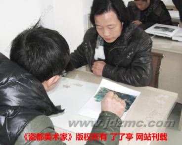 随后,学员谌玉、程慧萍将自己未完成的习作请大师指教,大师就此开始了身教手传的授课。耄耋之年的张松茂大师,微低着头,从构图到用笔,从立意到着色,都仔细讲解。学员们全神贯注地倾听着、注视着,生怕漏过了任何一个精彩的细节。在现场,学员们一边听着大师的讲解,一边通过教室里安装的一体机屏幕清晰地看到大师的起笔勾勒。有位学员还端着摄像机,摄录着大师现场绘画过程。时针将指12点,大师依然在专注地挥笔着色、解答学员们的问题。