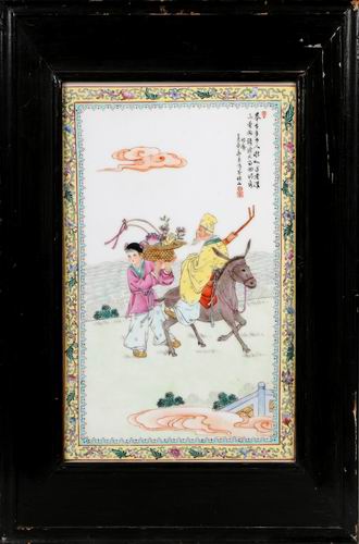 这套八仙瓷板共有四块,创作者将八仙中两人为一组,展现在一块瓷板之中,所采用的正是艺术瓷厂所专长的粉彩工艺。创作者尊重民间传说,将人们熟知的八仙与陶瓷艺术完美地结合在一起,其中身背葫芦的铁拐李;手摇棕扇的钟离权;倒骑毛驴的张果老;剑不离身的吕洞宾;长笛傍身的韩湘子;或工笔,或夸张,各个形象生动,尤其是人物的表情,更是刻画得极为细致,表现出了创作者深厚的艺术功底。加上粉彩瓷所特有的立体感,画面中的人物更是给人一种呼之欲出的感觉。除去在人物刻画上的用心外,创作者对于画面的构图和背景也是用足了笔墨,其中山石、松树、祥云等元素的出现,在装饰画面的同时,也凸显了八仙的仙风道骨之气。