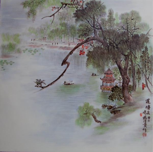 今年80岁的老艺人杨德贵,记忆中最难忘的是风景迷人的莲花塘。他用景德镇制瓷工艺中最具代表性的传统工艺粉彩为我们勾勒了一幅春光中的莲花塘。在这幅《莲塘春晓》里,画家在不大的瓷板上以妥善的经营、细劲的笔法和明快的色彩,画出了花木葱茏,绿意盎然的春光佳境。图中山青水秀,弥漫着氤氲的气息。在波光潋滟的水面上,两艘小船随波荡漾。不远处荷叶田田。在岸旁建有一亭台,一男一女正纵目四望,陶醉于明丽的莲花塘春色中。莲花塘岸边柳树低垂,抽出新绿的树木遍布莲花塘的四周,三三两两的行人在林荫小道漫步。