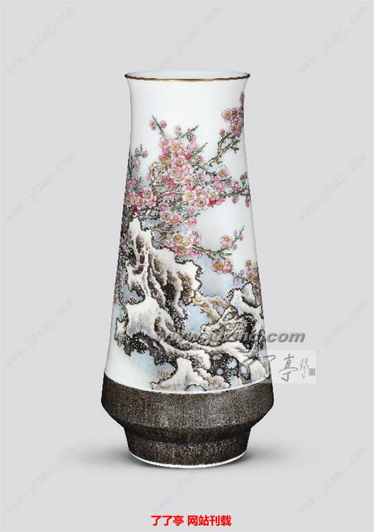 本作采用粉彩的工艺技法绘制而成。寒梅的高洁,装饰性强,既热烈又典雅,构图大胆的将梅花的枝干由左至中再向上延伸,蜿蜒虬劲,线条勾画的花朵圈点得错落有致,形象的表现出梅花集横、斜、倚、曲、左、雅、苍、疏之众美的绰约丰姿和超凡脱俗的气质。