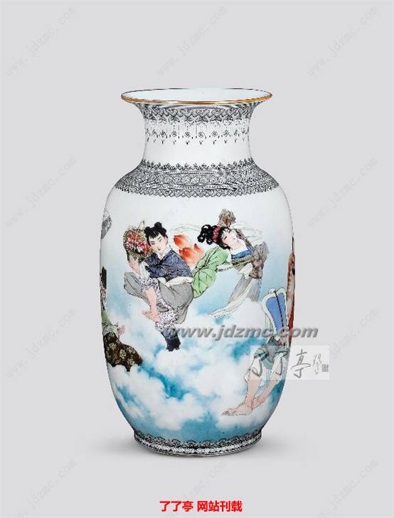 戴荣华的作品大多以人物为主,以山水花鸟为辅。但他的人物画和古代的人物画又有着区别,他在传统的技法和色彩上加入了素描的元素,笔下的人物线条优美、衣带飘逸潇洒。这件粉彩八仙图瓶为戴荣华唯一一件以八仙过海神话故事为题材的作品,通观全景人物布局得当,人物生动栩栩如生,特点刻画鲜明,与其气质相符,男性和年长者的角色在戴荣华的作品中出现次数极少,此件作品包含男女老少人物八个,是研究戴荣华粉彩人物成就不可多得的代表作品。