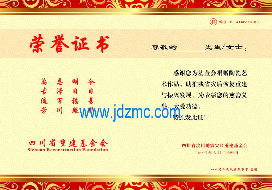 四川省汶川地震灾后重建基金会将向艺术家授予爱心证书。此证由政府公益机构颁发,对于艺术家而言极具纪念意义,且在部分职称评定、艺术家授誉活动中可作为加分依据。