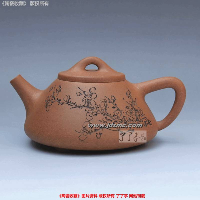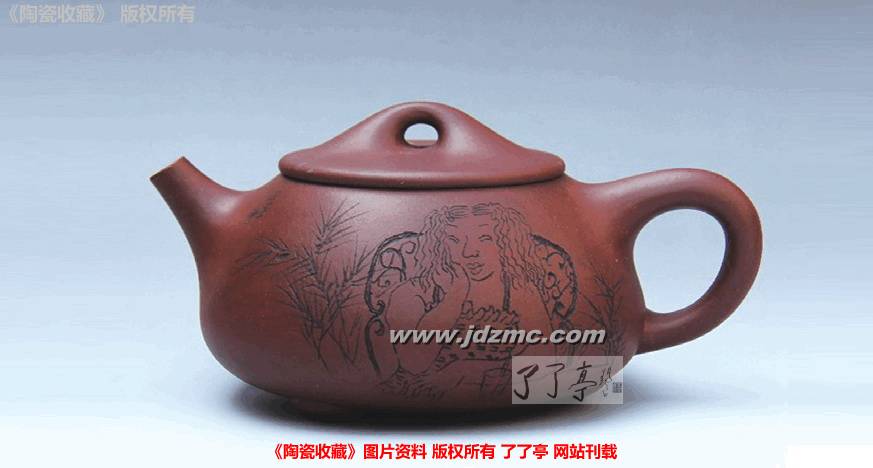 中国陶瓷设计艺术大师、省工艺美术大师汪洋说:“与瓷瓶上用笔不同,在紫砂壶坯体材料上刻,用刀的力度要更大些,对腕力、指力、眼力的要求,自然也更高些,而且不能更改,一不留神,这壶就报废了。”虽说,画瓷与刻紫砂壶分属不同的艺术范畴,但艺术总是有着相通的地方。比如,“陶瓷和紫砂都是利用材料坯体表现物象,如器型、图案、色彩等”,事实上恰恰是这些共性夯筑的基础,终令他抡起悟性的锥子,将自己的艺术个性在一只只紫砂壶上表现得洋洋洒洒、美轮美奂。