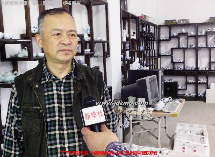 新华社记者电视采访余希平。2013 年4 月29 日,整点新闻向全球56 个国家播放,余希平陶瓷水墨彩山水画科学研究、陶瓷艺术创作成为记者采访的话题,点击新华网便可知晓。