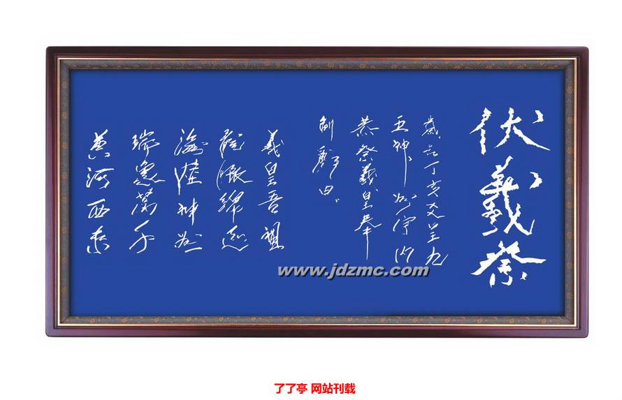 在《伏羲祭》的瓷板上,书法纵横牵制,勾点盘行中时见放逸,既流便于草,又开张于行,观其行刀,浓纤刚柔,燥润相杂,取妍取险,取刚取柔,莫不相得益彰,而且用刀流畅舒展,转 折清晰,起落分明,气脉连贯。整幅刀势的豪迈之气与词篇的豪放之情融于书法的谋局结体之中,显得灵动轩昂,恬澹雍雅。