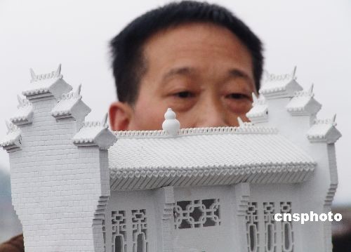 3月8日,江西省景德镇罗冬根展示作品瓷器群雕《大观园》。景德镇陶艺家罗冬根用6年的时间,制作出面积达80平方米,主件有300多件的瓷器群雕作品《大观园》。这部作品由建筑、园林、山水、民俗等部分组成,采用高白泥涩胎瓷制成,取题于《红楼梦》大观园,取材于苏州园林和江南徽派建筑。中新社发 石卫明 摄 |