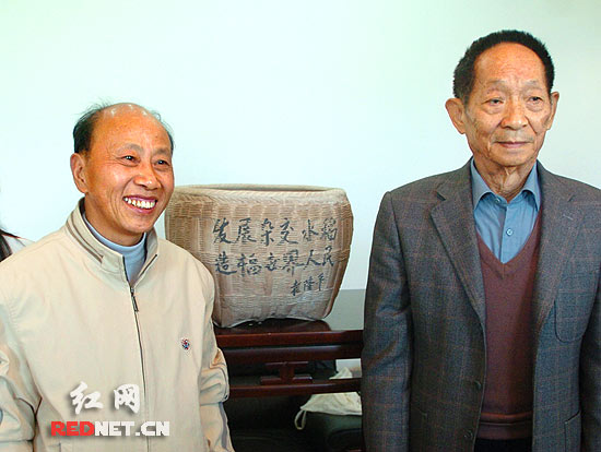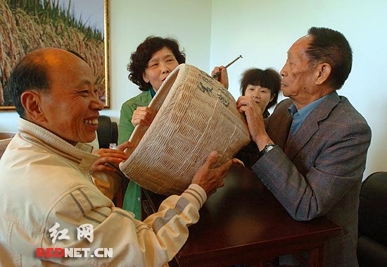 红网长沙4月17日讯(记者 明健飞 实习生 魏少婧)今天,在湖南省杂交水稻研究中心,袁隆平院士在陶艺作品《丰收箩》上题字:“发展杂交水稻,造福世界人民”。袁院士题字的这两只铜官窑陶坯,是湖南工艺美术大师胡武强老人制作的。陶坯将再次上釉后入窑烧制,之后将永久陈列在湖南杂交水稻展览馆。 [稿源:红网] |
