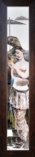笔者见到韩子丰近期制作的瓷画《恋》,让人眼前一亮。通观此作,用油画的表现手法在瓷上作画,可见作者的油画功底非同一般。画面构成简洁,一朵白云下面,一对青年男女共撑一把伞,身体依偎在一起,表情安详。看到此作不禁令人想起达芬奇的名画《蒙娜丽莎的微笑》,这幅画有多少人试着解读,但又有谁解析的完全明白,所以称为永恒的微笑。这可能是一切伟大艺术作品的特征,难以言说的意境。《恋》中依偎男女,展现给人们一种独特的气息。让人们感受到他们的血液里流淌着一代天骄成吉思汗的血脉,同时又浸润着中华民族汉文化的精神。
