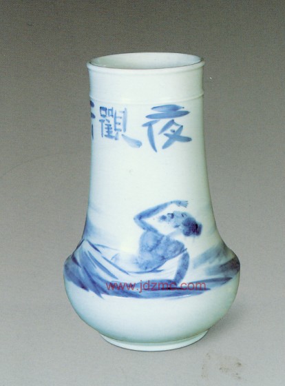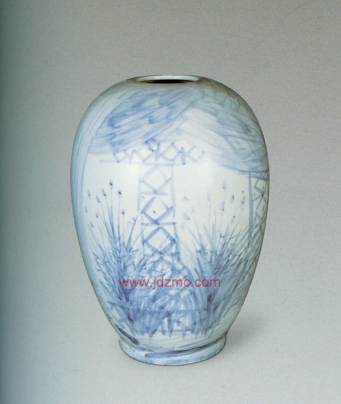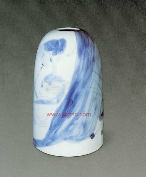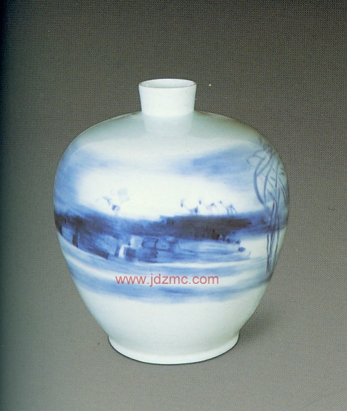 面对摆在案上或瓶或罐的素胎,观其形,取其势。心日中有一个基本的构思、取向。展开想象的翅膀。在那些素胎上我似乎看见了山岳冲天而起,吟咏寒江钓雪的诗心,遥祭天地大美的女媚,品味吹箫女子的恬淡幽静,手握用惯了的毛笔调合如同水泥桨一样的青花釉料。一·旦下笔,笔笔生发,随方就圆,顺势而为,求其自在。未来的模样月朦胧鸟朦胧,不见得成竹在胸,所谓成竹在胸在此并非赞誉之词,因为胸有成竹者易患匠人之气。自由自在,涂涂抹抹,不事雕琢,一生二,二生三,虚虚实实,疏疏密密,左顾右盼,举重若轻,统观全局,取合适度,当放则放,当收则收,放则尽情挥洒,收则刻画人微,随机应变,意到神随,从无到有,一气哈成,方能有趣,有味。其间难免有瑕疵,在我则不去管它,只要神在韵在。这是画家的本事。也是画家与匠人互为门内门外的分野。