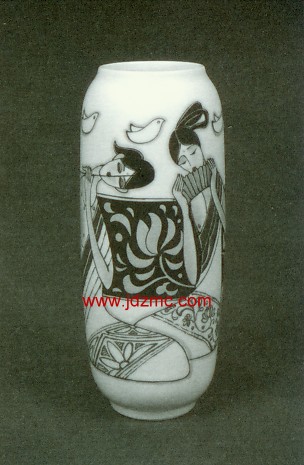 凭着感觉,我试探着这种格调,下到了成型车间。于是乎,《乐舞引凤图》腰鼓瓶问世了。虽然不是很成熟,但作为一种形式,它毕竟给人一种不同于一般的感觉。首先我把四个姿态不一的女子舞蹈刻划成像汉砖般的黑白的剪影动作,细部班驳,衣裙的外轮廓线条浑圆,形成了“软”